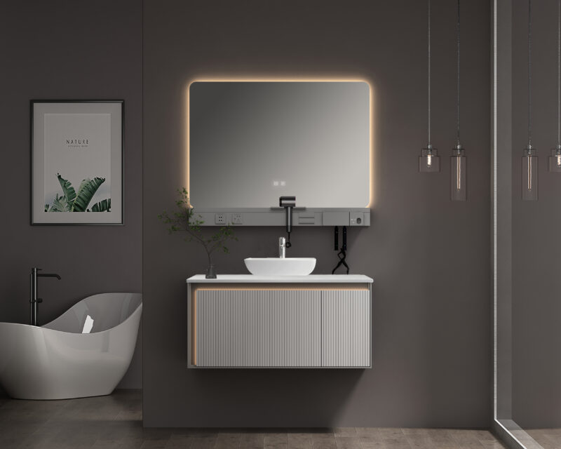 Καθρέφτης led καθρέφτη με αντιθαμβωτική λειτουργία, τρείς επιλογές θερμοκρασίας χρώματος και αυξομείωση έντασης (dimmer). Διαθέτει στο κάτω μέρος υποδοχή για ρεύμα και βάσεις στήριξης για οδοντόβουρτσες, πιστολάκι και είδη προσωπικής υγιεινής