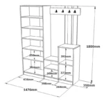- Η σύνθεση περιλαμβάνει: Ντουλάπι που εσωτερικά φέρει έξι ράφια και στο εξωτερικό της φέρει μεγάλο καθρέπτη. Τρεια ράφια για ανοιχτή αποθήκευση, δύο ντουλαπία πιο μικρά για εσωτερική αποθήκευση. Επίσης, διαφέρει τέσσερα κρεμάστρες για την τοποθέτηση παλτών, μπουφάν κλπ.