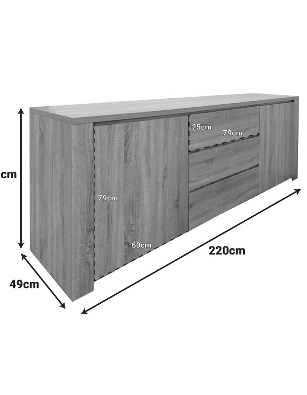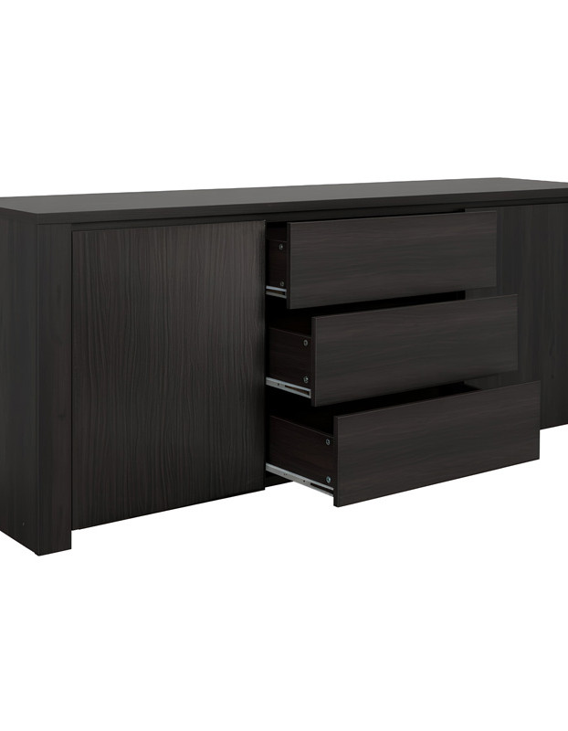Διαθέτει δύο πλαϊνά ντουλάπια με εσωτερικά ράφια, ιδανικά για την αποθήκευση αντικειμένων που θέλετε να διατηρήσετε διακριτικά. Στο κέντρο, τρία ευρύχωρα συρτάρια παρέχουν επιπλέον αποθηκευτικό χώρο για μικρότερα αντικείμενα, βοηθώντας στη διατήρηση ενός τακτοποιημένου περιβάλλοντος. Η επιφάνειά του προσφέρει άφθονο χώρο για την τοποθέτηση διακοσμητικών στοιχείων, φωτιστικών ή άλλων αντικειμένων. Η κατασκευή από υψηλής ποιότητας ξύλο σε φυσική απόχρωση προσδίδει μια ζεστή και φιλόξενη αίσθηση στον χώρο σας, ενώ η στιβαρή της κατασκευή εγγυάται μακροχρόνια ανθεκτικότητα. Αυτό το ευέλικτο έπιπλο είναι ιδανικό για το σαλόνι, την τραπεζαρία ή οποιονδήποτε άλλο χώρο χρειάζεται επιπλέον αποθηκευτικό χώρο με στυλ.