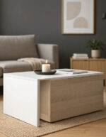 Tο μοντέρνο και λειτουργικό τραπεζάκι σαλονιού Extera αποτελεί μια κομψή προσθήκη σε κάθε σύγχρονο σπίτι. Ο συνδυασμός του λευκού χρώματος με τις ξύλινες λεπτομέρειες δημιουργεί μια αίσθηση ζεστασιάς και φωτεινότητας στον χώρο, ενώ ο έξυπνος σχεδιασμός του προσφέρει πρακτική αποθήκευση.