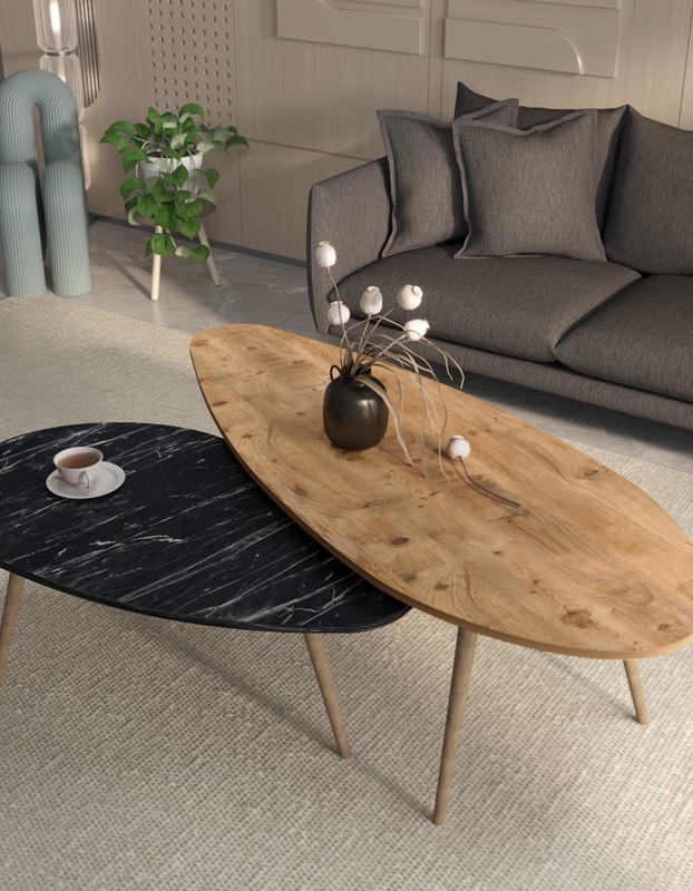 Αναβαθμίστε το σαλόνι σας με αυτό το εντυπωσιακό σετ δύο τραπεζιών, σχεδιασμένο για να προσφέρει τόσο στυλ όσο και πρακτικότητα. Τα δύο τραπεζάκια διαφέρουν σε μέγεθος και ύψος, επιτρέποντας σας να τα χρησιμοποιήσετε με διάφορους τρόπους—είτε το ένα μέσα στο άλλο για εξοικονόμηση χώρου, είτε το ένα δίπλα στο άλλο για περισσότερη επιφάνεια.