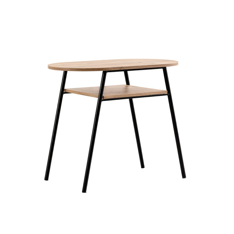 Με μεταλλικό σκελετό σε χρώμα μαύρο και ξύλινες επιφάνειες στο χρώμα του δρυ.