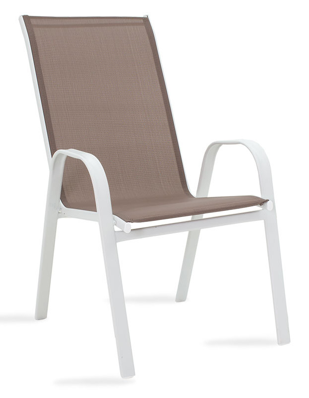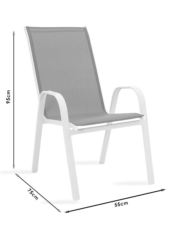 Σταθερός σκελετός από μέταλλο με αντοχή στην καταπόνηση και στη φθορά. Κυρίως σώμα καρέκλας από εξαιρετικής ποιότητας textilene. Το textilene είναι ύφασμα μεγάλης αντοχής στην ηλιακή ακτινοβολία και την υγρασία ενώ παράλληλα αφήνει το δέρμα να “αναπνέει” δημιουργώντας έτσι άνεση στο κάθισμα.