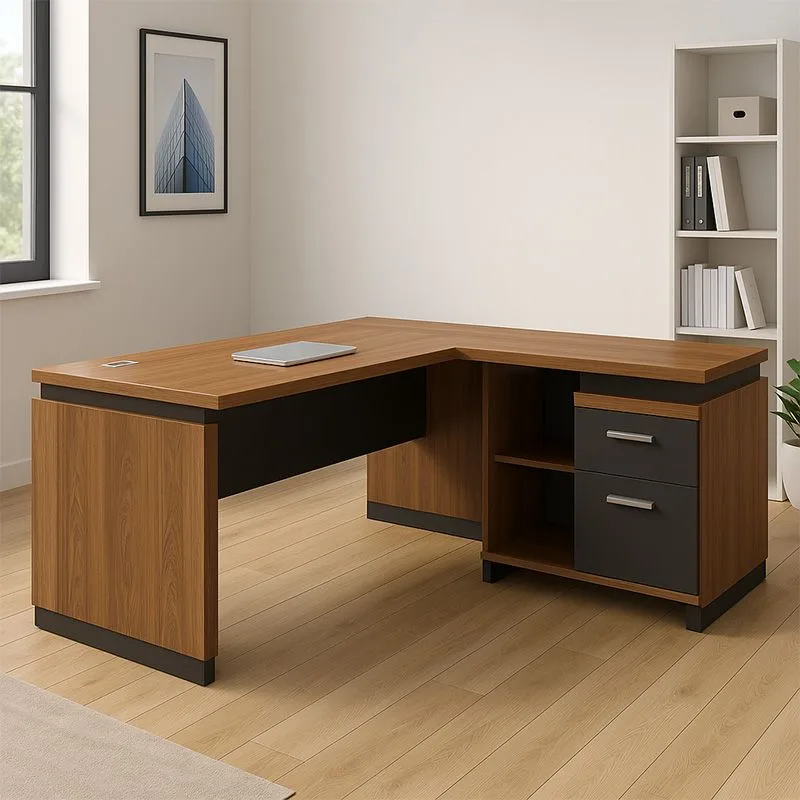 Γραφείο διεύθυνσης αναστρέψιμο (τοποθετείτε σε όποια πλευρά θέλετε), στον εντυπωσιακό χρωματισμό του καρυδί – ανθρακί. Κατασκευασμένο από υλικά υψηλών προδιαγραφών και σύμφωνα με τις εργονομικές απαιτήσεις του σήμερα.