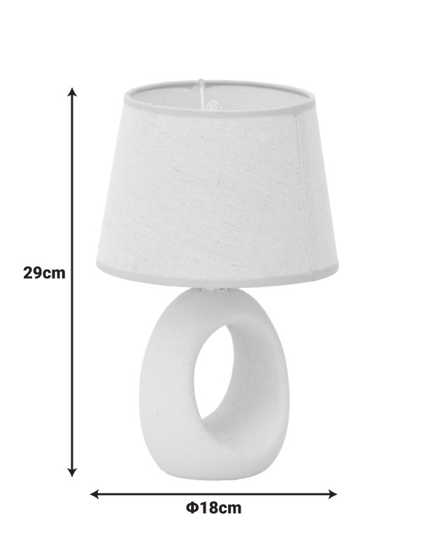 Η στρογγυλεμένη, κεραμική βάση διαθέτει μια διακριτική υφή, ενώ το λιτό, υφασμάτινο αμπαζούρ διαχέει το φως ομοιόμορφα, δημιουργώντας μια φιλόξενη και χαλαρωτική ατμόσφαιρα.